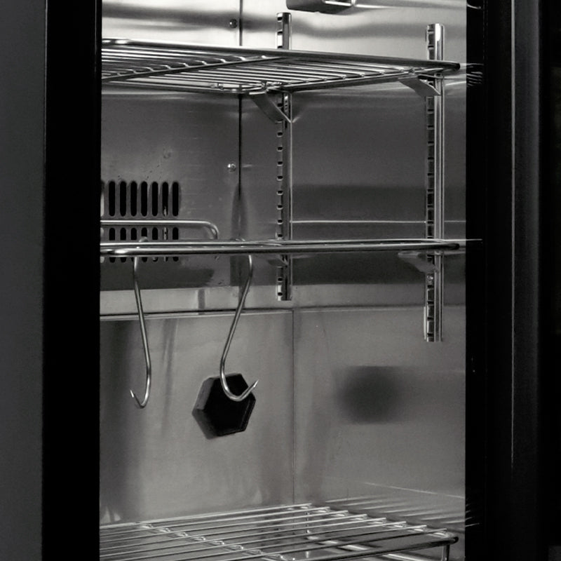 Easy to clean stainless steel shelves provide ample room and durability for your dry aged meats and cheeses.